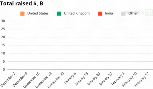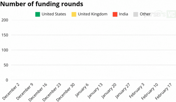 Venture Capital News. Funding rounds, statistics Week of February 11 - February 17: United States (29 - $3.56B), United Kingdom (5 - $86M), India (6 - $261M), Israel (3 - $53M), Sweden (3 - $7M)
